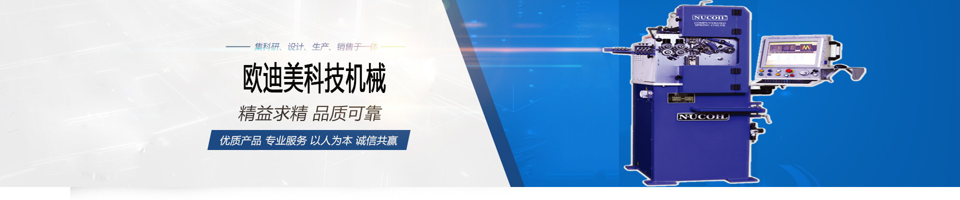 歐迪美公司是一家專業從事數控彈簧機的研發、設計、生産和銷售一體化的高新技術企業。基于使用者的角度研發,追求高品質、高穩定性、調機簡便、快速、提高生産效率爲目標,將不斷研發創新爲宗旨,投入更多資金、人力、創造更新更高品質高性價比的機器。我司于2020年10月成功并購臺灣可利實業股份有限公司,并引進了其公司的專業成熟産業技術,硬軟件設施和人才團隊,從而壯大了公司的生産規模及研發技術團隊,大力推動了整個産業技術的不斷發展,爲越來越多的用户提供性能卓越且高性比的彈簧機設備。odmaytech machinery co., ltdis a company specializing in the production ofspring machinery and accessories. of the ···